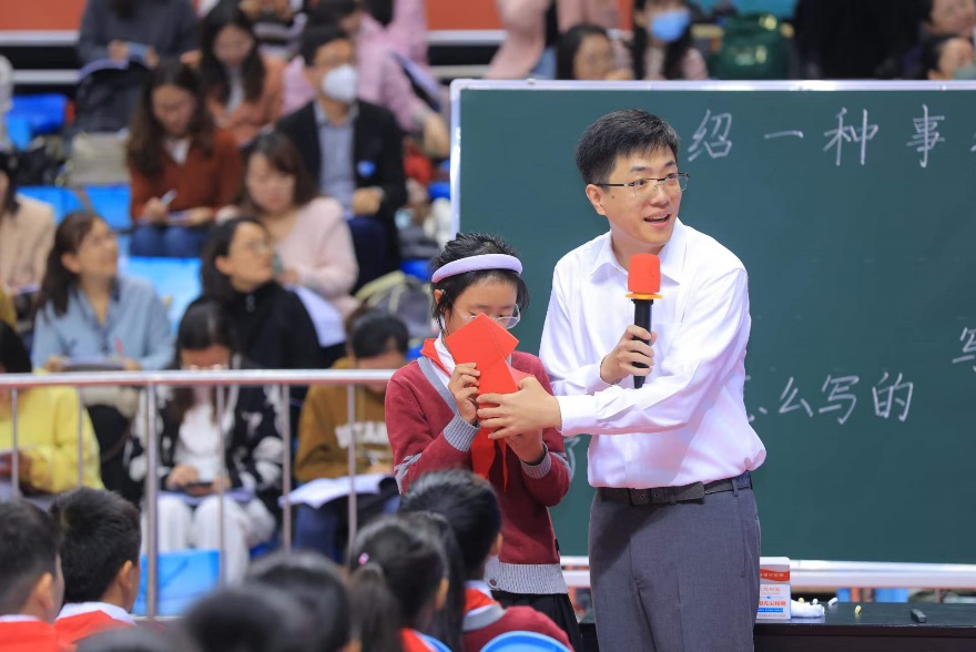 此次,王峰授课的课题是五年级习作“介绍一种事物”。本次授课经过备课组成员的精心准备,是开云附小2014年获得首届国家级教学成果一等奖的“小学语文主题教学实践研究”的新发展。授课力求在课堂上体现主题教学“语文立人”的思想,彰显开云附小“儿童站立课堂正中央”的教育哲学,并在此基础上充分落地语文新课标精神,以此统筹教材单元内部的整体联系,取得了良好的课堂教学效果。