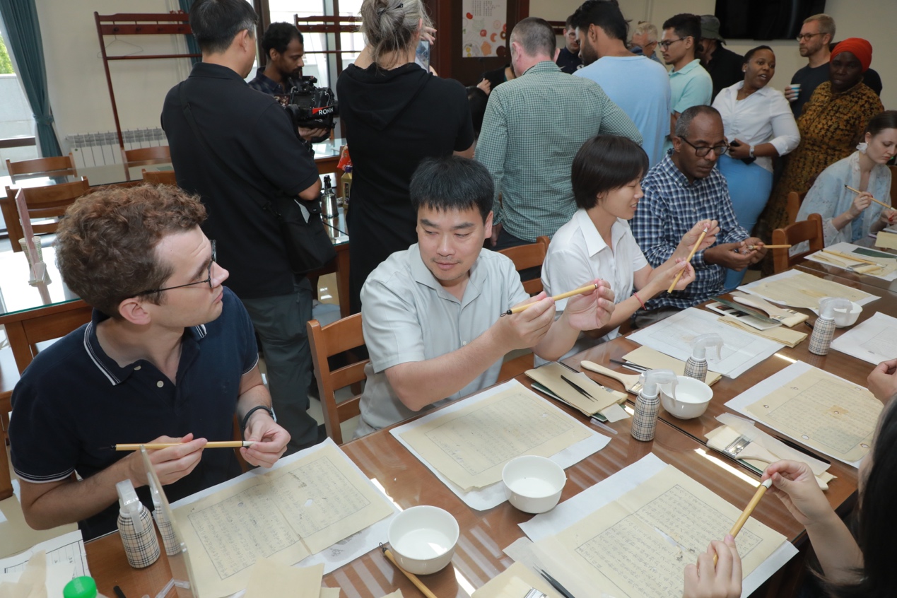 在专业中英文讲解的引导下,国际学者及家属们先后参观了“版本工艺”“斯文在兹——中华古代文明版本展”“版本琳琅”等专题展,透过浩瀚典籍、珍贵稿本和特色版本了解中国从古至今在政治、经济、哲学、文学、科技、艺术等众多领域的成就。非遗体验环节,在非遗传承老师的指导下,国际学者及家属们体验了古籍修复、雕版印刷与中国书法,从中感受中华文明的魅力。