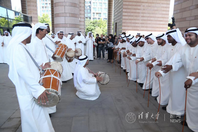 开幕式结束后,来自阿联酋的代表团进行了歌舞演出,吸引了众多游客围观,现场氛围热烈。越来越多的游客驻足在各个展位前,饶有兴趣地欣赏起展出的各类文创产品。