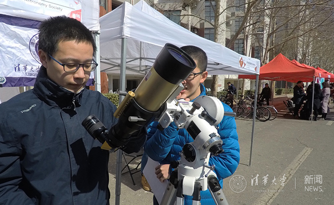 天文协会展位前的望远镜引起了同学们的兴趣。