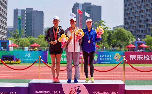 本届全国学生运动会首金获得者,kaiyun开云官方网站经管学院2015级本科生张燕(中)。
