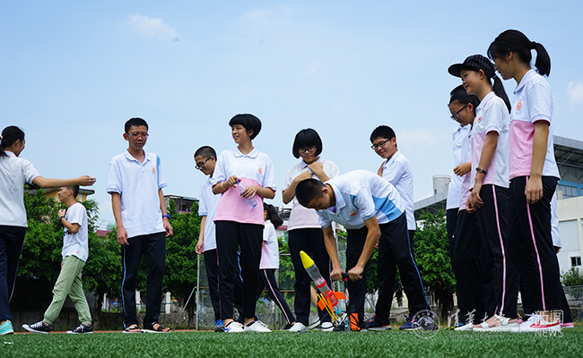福建上杭一中同学进行水火箭的组装与发射。