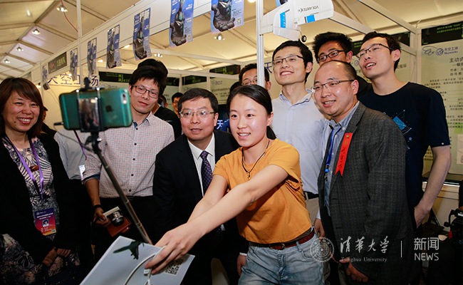 “挑战杯”科展上校长邱勇观看学生作品并与学生合影。