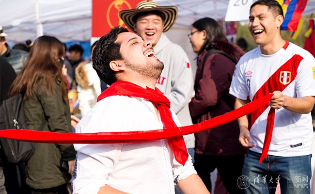 拉美联合展棚的“弯腰过绳”游戏。供图:国际处