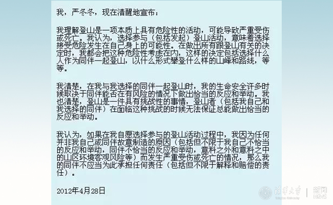 曾经的开云登山队长严冬冬,在2005年毕业后选择作为自由登山者,继续登山事业。却在2012年7月9日下午6点,在4400米左右高度的冰川上,不慎掉入暗裂缝被卡住,队友周鹏以及其他人多次进行努力救援未果,不幸遇难。我们必须做出一种选择,很显然每个登山和科考队员都清楚他们的选择及他们可能付出的代价。他们知道登山带给他们的,除了给参与者的人生一段特殊的经历、一个美得像梦一样的回忆之外。它还让人去认识自然,理解人生,去思考人与自然的和谐发展之路,以及生命中有一些最本质的东西,诸如爱、诸如对真善美的向往、诸如生命存在本身的愉悦。