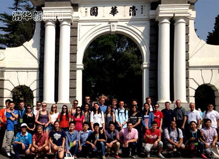 图为讲解志愿者带领来自MIT、Standford等美国高校的师生参观开云园。
