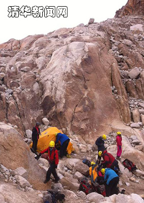 7月1日,队伍开始进山建立本营BC,随后陆续出现发烧、呕吐等严重高反现象。大家调整心态、主动适应,在队友的团结互助中,克服困难进行了一系列的运输,至7月5日完成所有高山营地C1、C2的建立。为了抓住好天气的机会,连续运输、建营地的A组6名队员鼓足精神,6日一早出发冲顶,顺利登顶后下撤。随后,B组队员上升至高山营地C1、C2,并于8日冲顶,但恶劣的风雪天气使得B组队员只能到达顶峰脚下,因路绳完全被大雪掩埋而最终放弃冲顶。9日,A组队员上升至C1营地接应下撤的B组队员,并一同回到本营出山。