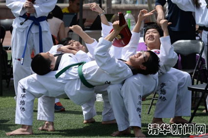 图为学生跆拳道爱好者协会组织同学进行素质拓展训练体验。