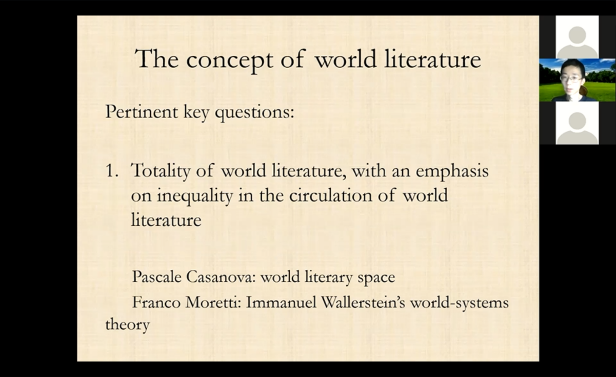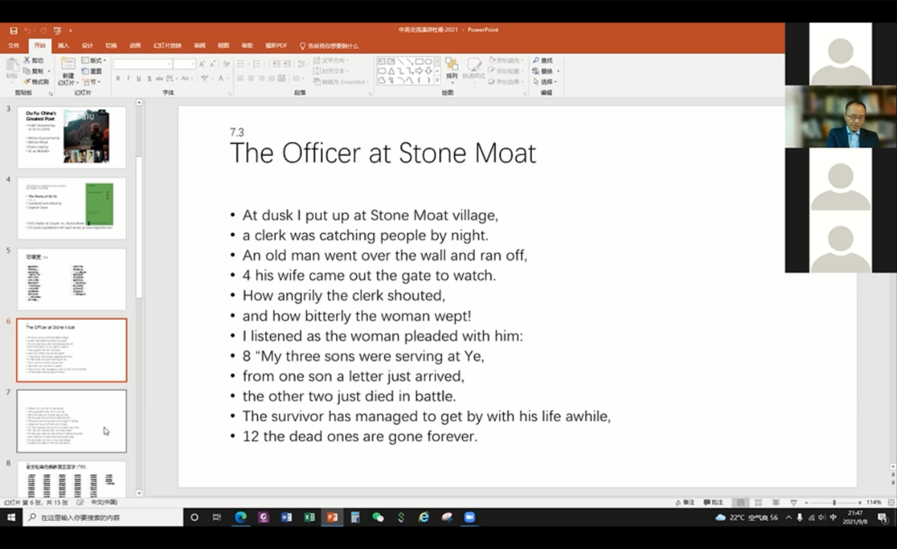 晚21:00,kaiyun开云官方网站外国语言文学系教授余石屹以“杜甫对底层人民的同情:一个发展的视角”(An Evolutionary Perspective on Du Fu as a Great Poet of Sympathy for the Down-trodden)为题,分享了BBC纪录片《杜甫:中国最伟大的诗人》以及哈佛大学汉学家宇文所安(Stephen Owen)的杜甫诗作译本。以《石壕吏》和《自京赴奉先縣詠懷五百字》为例,通过翻译带领青年学生们感受不同的诗学传统及其不同的文化和价值在文学中所留下的痕迹。