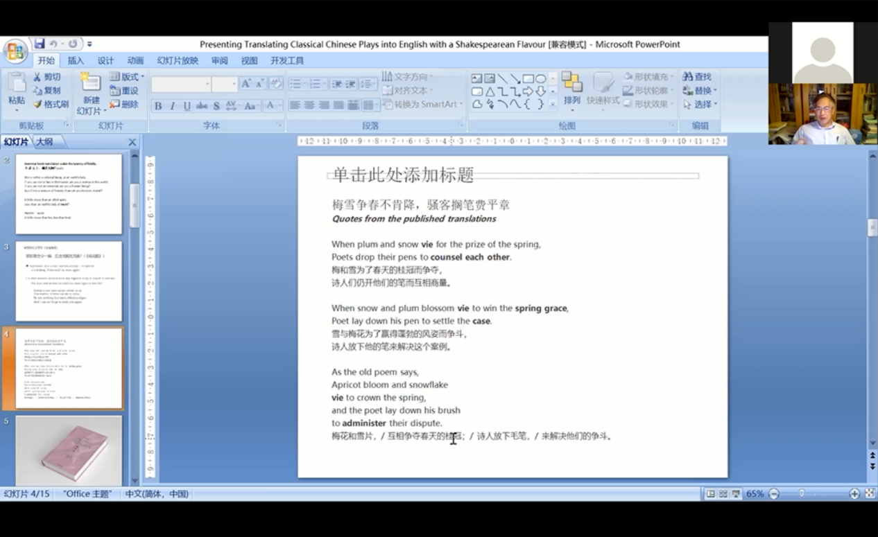 9月7日晚20:00,北京大学外国语学院英语系教授黄必康带来了题为“将中国古典戏剧翻译成莎士比亚风的英文”(Translating Classical Chinese Plays into English with a Shakespearean Flavor)的讲座。黄必康认为,翻译不是译者的自我陶醉,更要重视读者的感受。他将中国古典名剧《牡丹亭》用莎士比亚戏剧的风格进行英译,强调诗句形式与文化思想的契合。