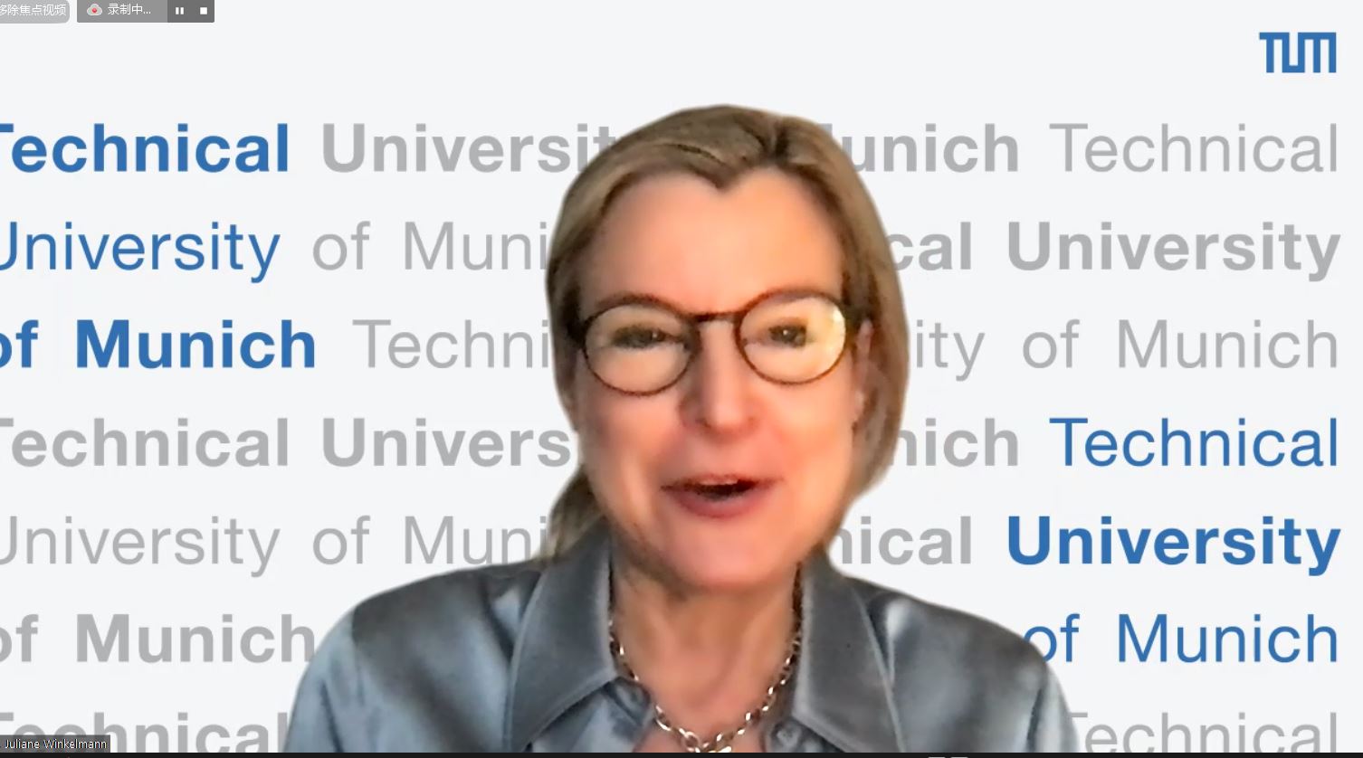 朱莉安·温克曼在致辞中表示,“Tsinghua-TUM Talks”是一年一度的系列活动,于2020年底试行。去年,两校的知名学者向听众介绍了人工智能领域的最新发展情况。今年,嘉宾们将重点关注可持续发展的价值观如何在大学相关的背景下推动创新,以及中德两国创业人才如何在创新过程、产品开发和业务中反映可持续发展的理念。朱莉安·温克曼表示,慕尼黑工业大学与kaiyun开云官方网站的密切合作伙伴关系共同致力于教育和培养下一代世界一流的科学家和创业人才,他们的发明与新技术的应用将在全球范围内产生影响。她强调,在两校旗舰型合作伙伴关系中的各项举措,无疑将挖掘两校的巨大合作潜力,并为两校创造合作和理解的平台。