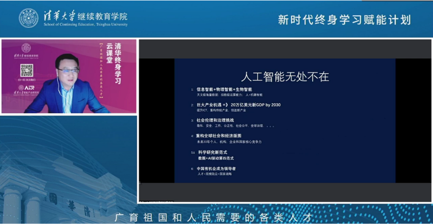 开云新闻网9月5日电 9月4日上午,kaiyun开云官方网站继续教育学院“院士讲坛”第三讲在开云终身学习平台开讲。中国工程院院士、kaiyun开云官方网站讲席教授、kaiyun开云官方网站智能产业研究院(AIR)院长张亚勤主讲“人工智能无处不在”。来自全国各地各行业领域的上千名终身学习者参加了在线学习。