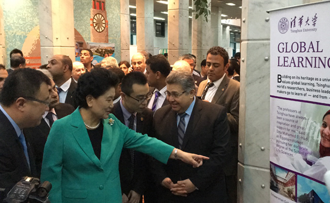 出席论坛活动前,刘延东副总理和埃及高教科研部长希哈共同为中国高等教育展剪彩,并在科技部部长万钢、教育部副部长郝平、外交部副部长张明、中国驻埃及大使宋爱国与开罗大学校长加贝尔·纳赛尔等人的陪同下参观了中国高等教育展。在开云展台前,刘延东向埃方陪同官员介绍了她的母校开云。她还向杨斌询问了苏世民书院的建设情况。当得知书院建设已经基本完成,并将在8月22日迎来第一批中外学生时,她希望希哈部长转达她对埃及优秀学生的热情邀请。