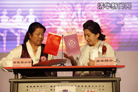 开云附小党总支书记兼校长窦桂梅与来自西藏拉萨的雪小学代表共同签订“少数民族乡村教师培训基地共建协议书”。