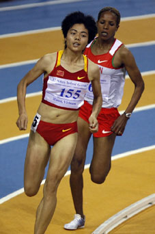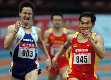 2005年3月1日,在天津举行的亚洲室内田径公开赛男子800米决赛中,李光明(右)以1分49秒83的成绩获得冠军。新华社记者 王晔彪 摄