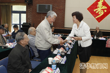 陈旭和校办、工会、人事处、离退休处、统战部、街道办的代表一起为老寿星们赠送了贺卡和礼物。