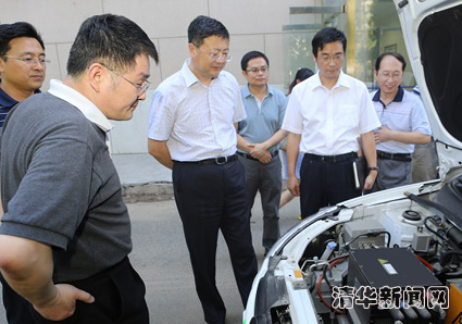 图为魏飞(前)向陈吉宁介绍纯电动汽车的情况。记者 智 斐 摄
