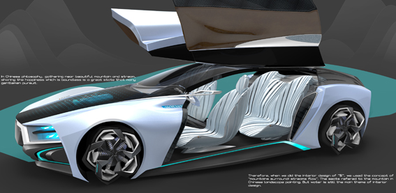 《香都》,是一款面向中国新兴高收入群体的一款豪华轿车。整车外形将水奔腾时的动感与静谧时的婉约融合在一起,在动感中不失优雅,充满东方韵味。在中国人的观念中,有山有水、其乐融融,是君子所追求的生活境地,所以在掣的内饰中,采用了群山环抱,静水萦流的意向,座椅吸取中国山水画中的群山元素,而水则是内饰中最主要的氛围元素,同时也起到了调节温度湿度的作用。