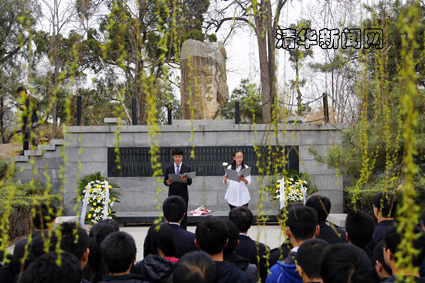 祭奠活动开始后,老师和同学们手握白菊,庄重默哀。4名学生代表向纪念碑敬献了写有“缅怀先烈,激励后人”与“行健新百年,共筑中国梦”的花篮。