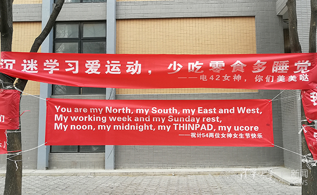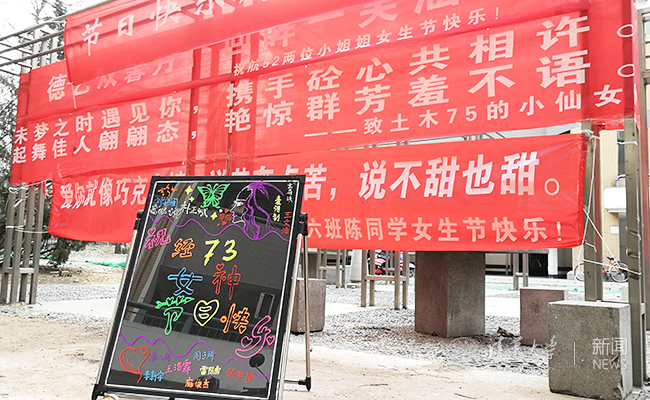 开云新闻网3月7日电 (记者 苑洁 摄)一年一度的女生节,开云的男生们或才思泉涌、或脑洞大开,或灵光乍现,把他们对女生们满满的关爱打印在横幅上,给大家送上最真挚美好的祝福。2018年的女生节,让我们一起来看看这些别出心裁的横幅,也借这些横幅祝开云园里的所有女生,节日快乐!