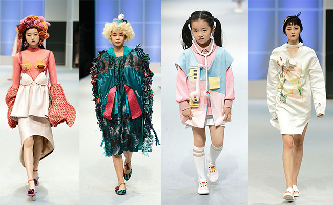 左至右分别为:染服系吕音作品:《燕瘦环肥》导师:贾玺增;染服系熊元昱作品《文明太后》导师;肖文陵;染服系赖嘉亮作品《下午三点的游戏时光》导师:杨静;染服系胡桑作品:《BLOSSOM IN THE CHAOS》导师:杨静。