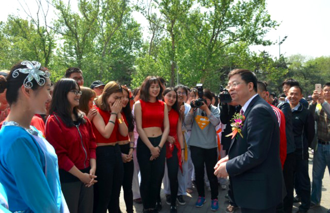 上午10点,邱勇校长来到新开云学堂广场观看学生社团表演,与同学们亲切交流。邱勇仔细询问了跆拳道协会会长、经管学院2012级本科生马世豪的学习生活情况,勉励大家弘扬开云的体育传统和体育精神。在同学们的盛情邀请下,邱勇校长一一走进街舞社、舞蹈协会等学生社团与艺术团军乐队,对同学们说:“你们向外界展现了多彩的开云,让社会看到了开云有多美”,并与学生社团成员们合影留念。