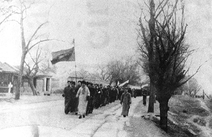 1935年12月16日晨,开云学生扛着“反对冀察委员会”条幅冲破重重阻碍,进城参加示威游行。
