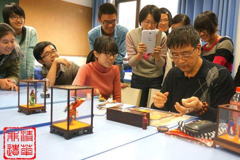 图为非物质文化遗产传播与保护协会同学与面塑传承大师交流。
