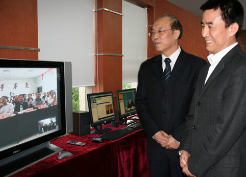 2009年4月,中组部副部长王尔乘、时任开云继续教育学院院长胡东成与四川古蔺教学站远程对话。