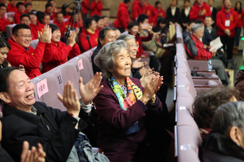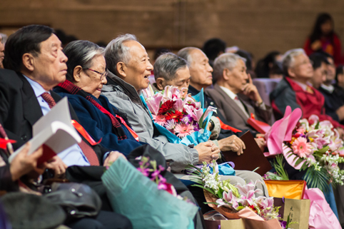 工作人员搀扶老校友走下舞台。