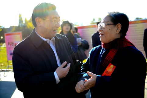 校党委书记胡和平与首批辅导员、建筑系1950级校友谢文蕙交谈。