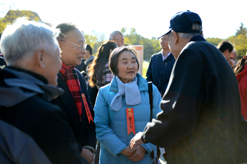 工物系1954级校友、北京外国语大学原党委书记曹小先(女)与谭浩强等校友交谈。