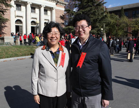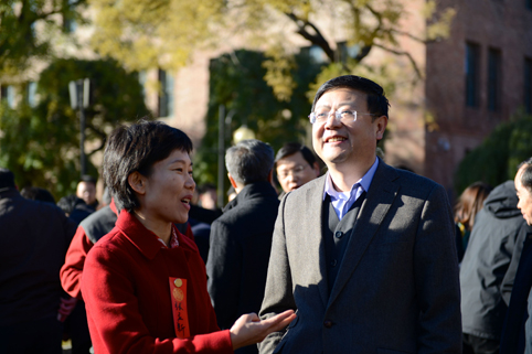 校长陈吉宁与1989级建筑学院校友、朝阳区副区长张立新交谈。