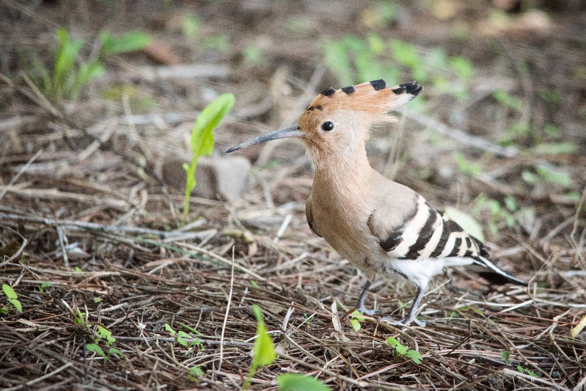 低头看看地上也许有所收获,体型较大的戴胜蹑手蹑脚地在草地上踱步,时不时用细长而弯的喙部猛戳地面,它是在捕捉泥土里的小型昆虫,而非像啄木鸟一样捕捉藏匿在树干中的昆虫。所以,看到它长长的嘴可不要再叫人家啄木鸟了!戴胜名字的由来十分有趣,“胜”指古代女性的一种头饰“华胜”,因此戴胜就是形容它像带着头饰的鸟。平日里,它头顶上的丝状花冠叠在一起,而在受惊或兴奋时,花冠便会展开,颇有些印第安武士的气势。