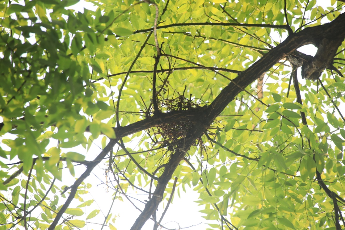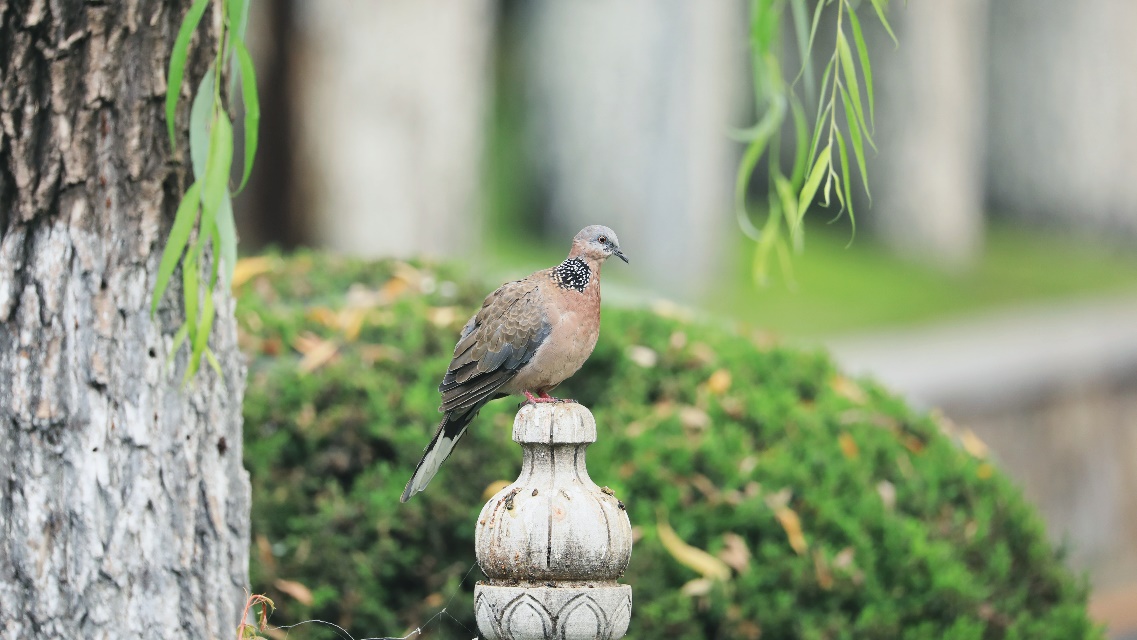 今年夏天,园子里多了一窝临近出巢的珠颈斑鸠。在树枝间,几个草棍稀稀疏疏地搭在一起,一副弱不禁风的样子,这结构颇为松散的小巢并非个例,珠颈斑鸠在筑巢这方面一向“佛系”。