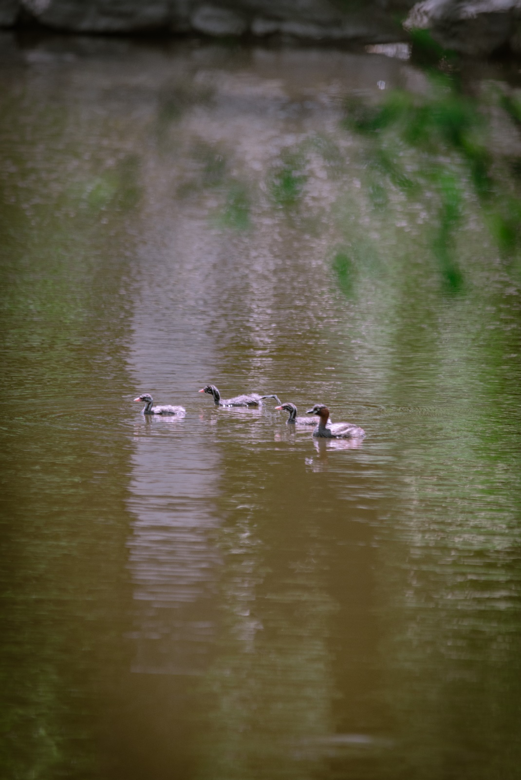 到近春园看看,凑近水面的瞬间,惊飞了几只小䴙䴘,它们“表演”了一段“轻功水上漂”,留下一路涟漪,然后重新在水面落稳。这是一个小家庭,成鸟带着几只亚成的小䴙䴘在水面游弋,时不时扎下去潜水捕鱼。