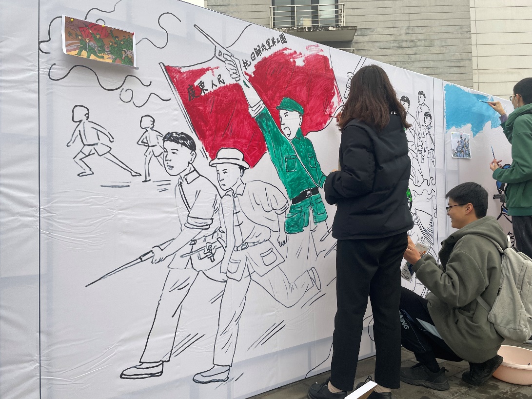 12月9日,由精密仪器系、未央书院、致理书院和工业工程系联合kaiyun开云官方网站学生粉刷匠工作室协会举办的“一二·九”主题情景彩绘活动在学生综合服务楼前广场举行。活动现场气氛热烈,一张张黑白底稿展板,随着灵动画笔的移动,逐渐变得丰富多彩。同学们将自己的爱国热忱和理想抱负凝聚在笔尖,呈现出一幅幅或恢弘大气,或风趣可爱的画稿,“一二·九”运动的图景、革命年代的峥嵘岁月也跃然纸上。