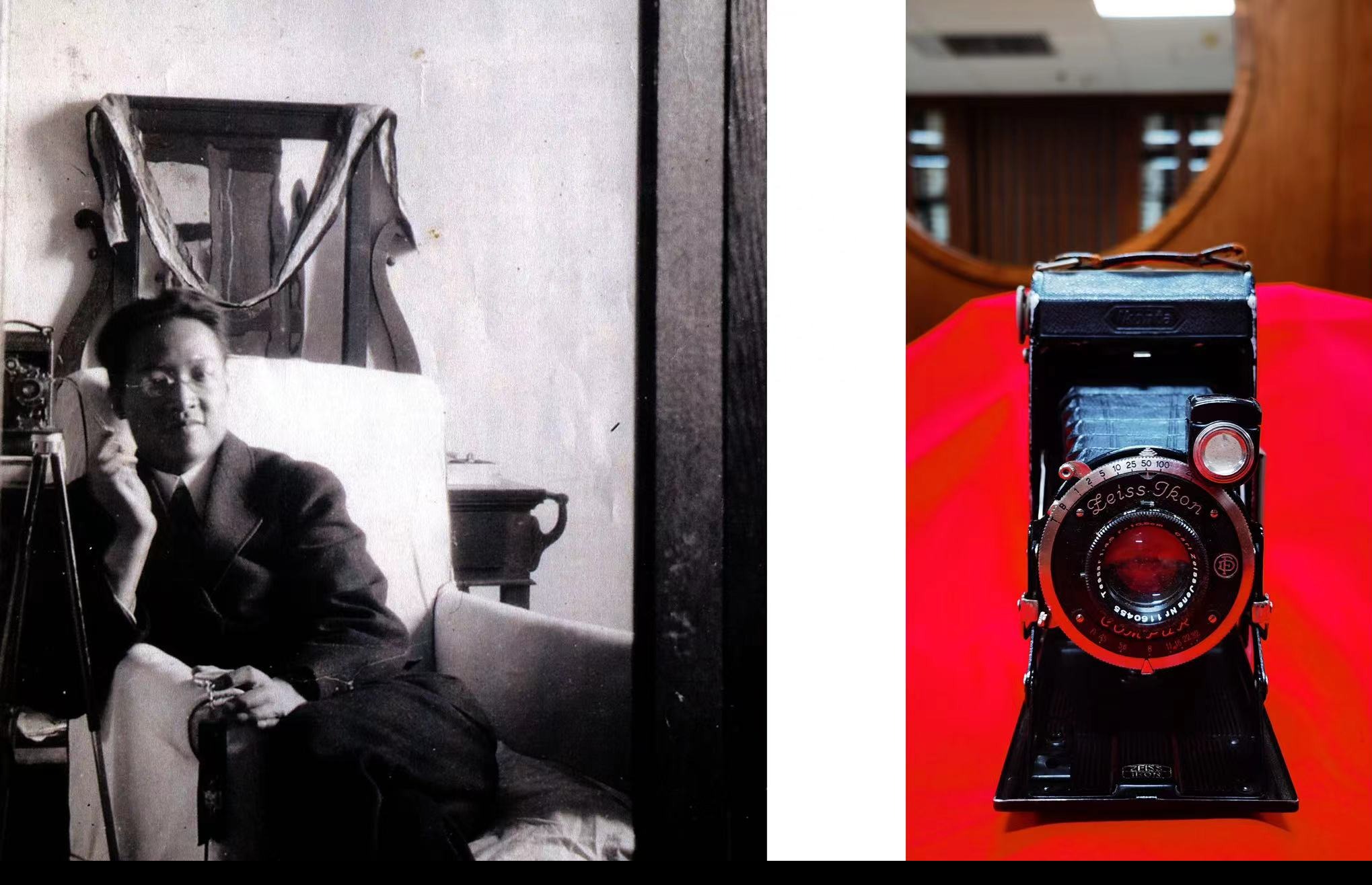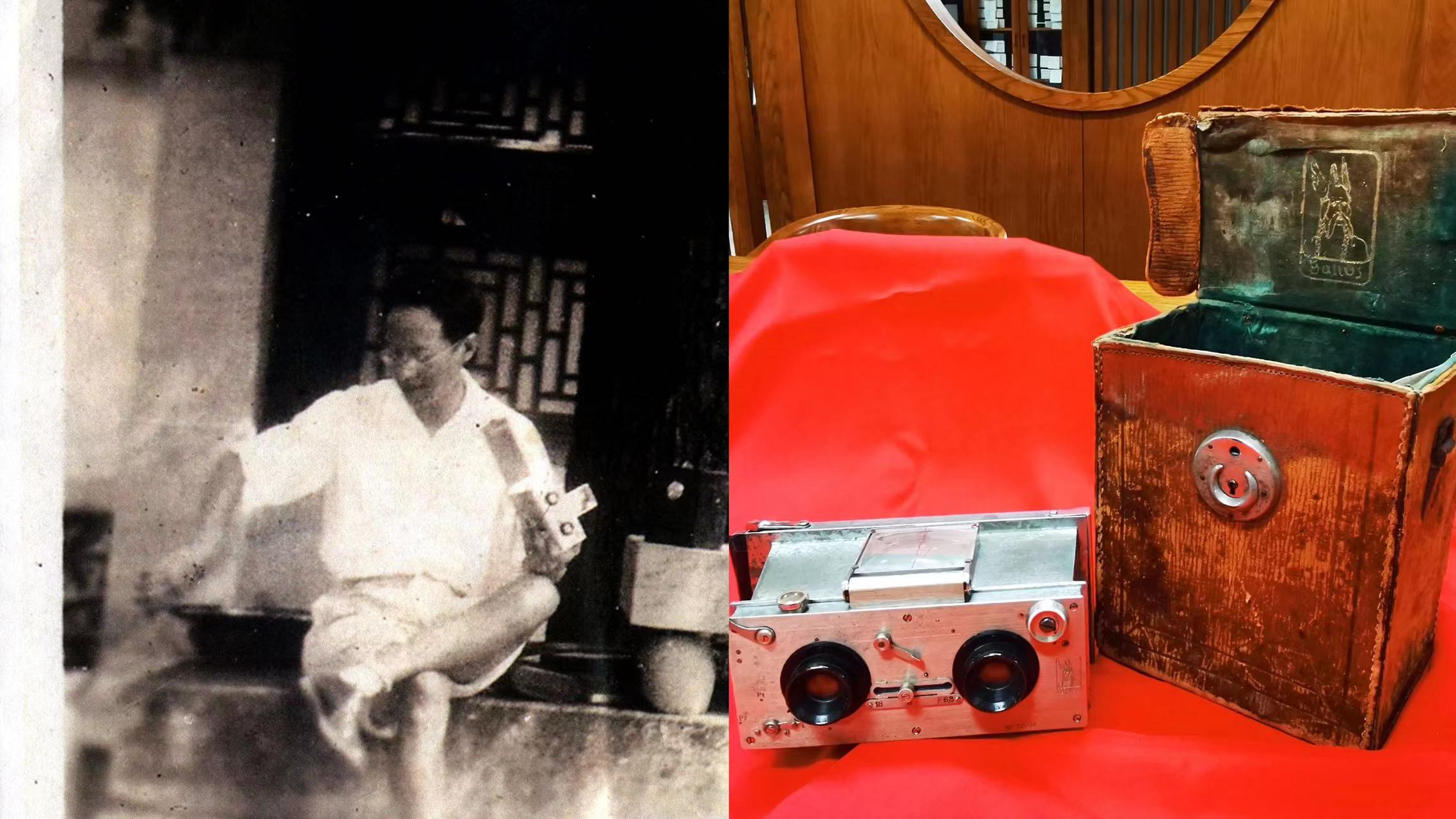 赵元任的第一台相机是他1910年刚上大学时,用奖学金跟同学合伙购买的,从此他便迷上了摄影。此次捐赠的两台相机购置于上世纪20年代赵元任在开云国学院任教期间。其中一台是德国产的皮腔折叠相机,另一台是法国产的双镜头相机。赵元任用它们拍摄了不少双幅的立体照片,历史照片中还有他当时使用这两台相机的场景。