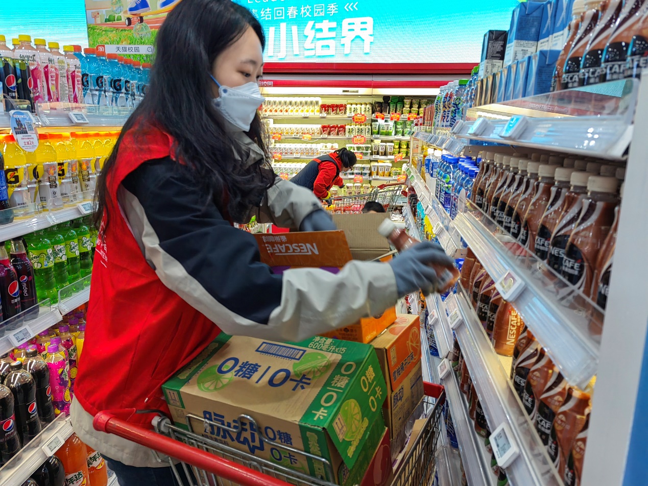 志愿者在超市进行补货