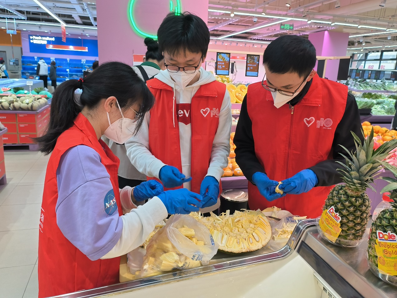 志愿者在超市处理分装水果