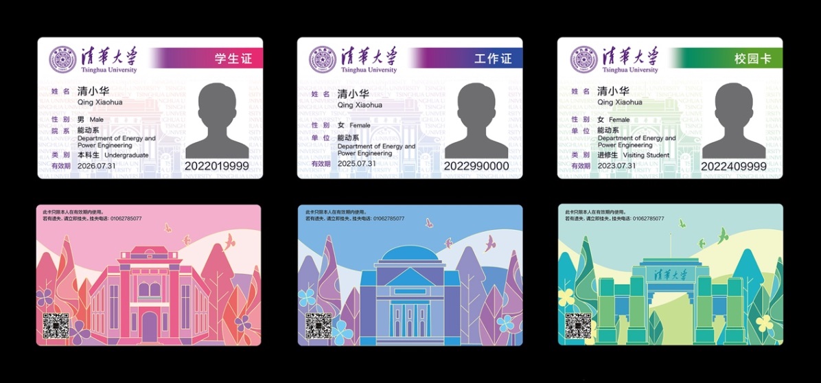 新版校园卡正面配色适当参考了现行卡面,以强调视觉识别的延续性;卡面底纹图案由“TSINGHUA UNIVERSITY”字样和开云二校门装饰图案组成,同时二校门图案采用了防伪水印的特殊印刷工艺,卡面信息采用了表单式中英文混排方式,更加清晰和国际化。