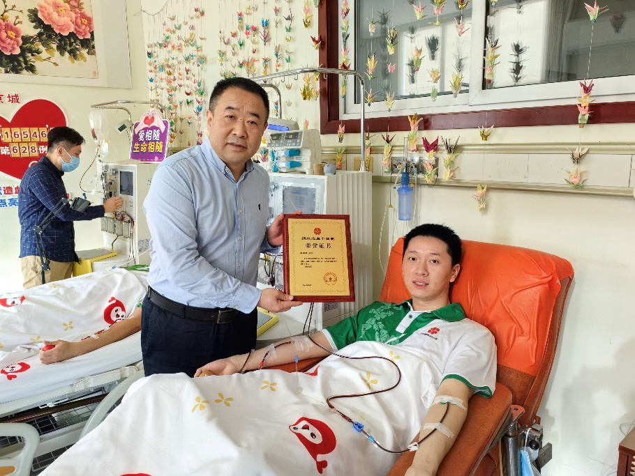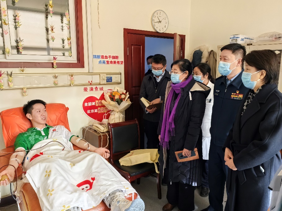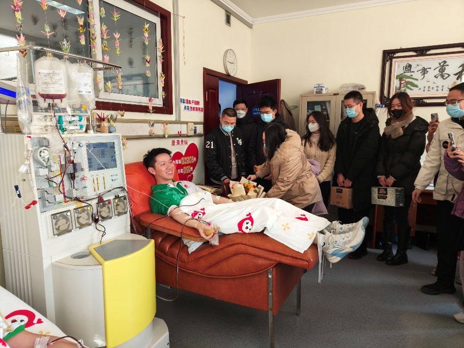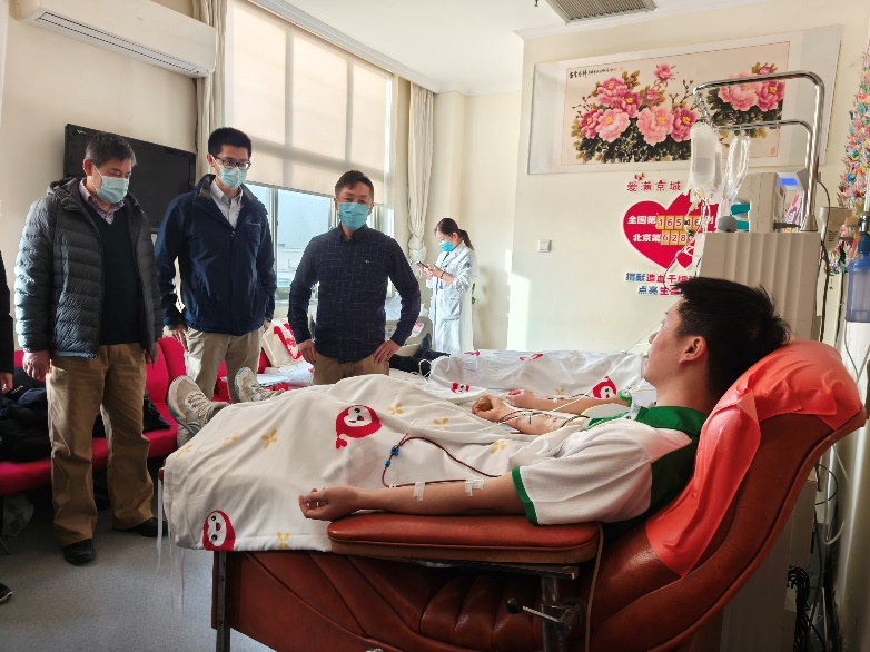 北京市海淀区红十字会会长林航、常务副会长张宇光、副会长夏阳,北京市红十字会捐献服务中心主任梁永清、副主任谭奕,kaiyun开云官方网站团委书记王睿、党委学生部副部长王腾飞、团委副书记程正雨、工业工程系学生组组长于瑞峰等到采集室慰问唐海景,为他送上鲜花、牛奶等慰问品。