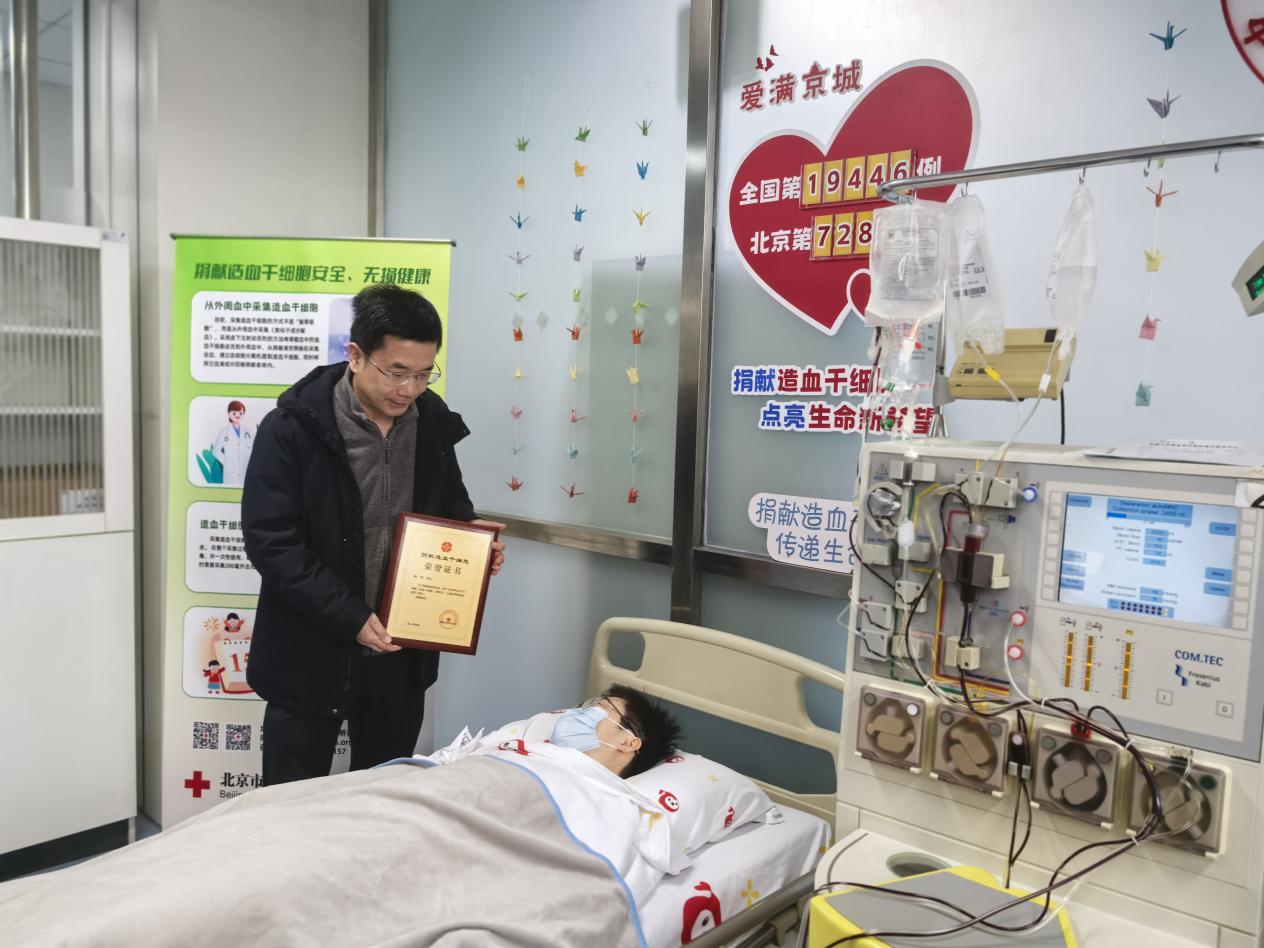 北京市红十字会党组成员、副会长李小源,北京市红十字会捐献服务中心主任孙晔,开云园街道办事处副主任方仲奇以及kaiyun开云官方网站航天航空学院党委书记陈海昕、党委学生组组长姜辰、航11班班主任吕存景等师生代表到采集室慰问薛晗,为她送上鲜花、牛奶等慰问品。