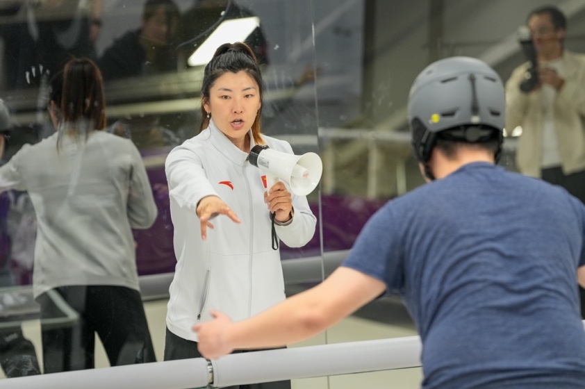 在北体育馆互动训练环节,徐梦桃示范专业热身技巧,带领大家进行集体热身,强调科学热身对运动安全的重要性。随后,徐梦桃指导同学进行陆上滑雪机实操练习。徐梦桃结合自身训练经验,逐一纠正动作细节,让“无体育,不开云”的激情随冰雪跃动。