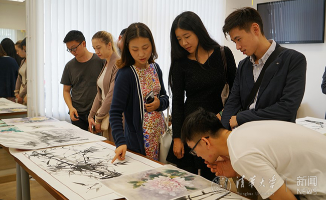 同学们在莫斯科中国文化中心欣赏俄罗斯学员的国画作品