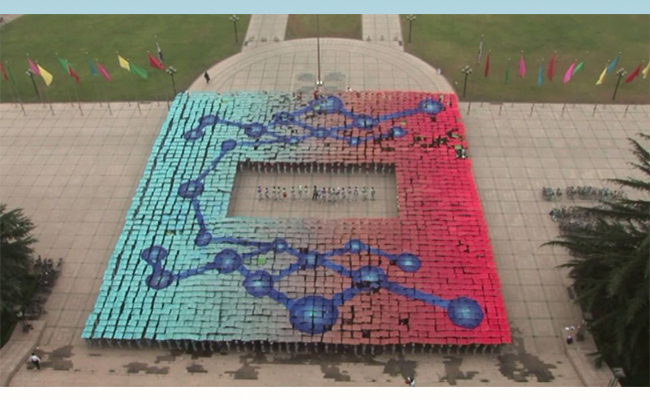 拼出的分子链代表着生物技术的发展,笑脸符号则表现了在网络时代人与人交往的方式,传递出喜庆欢快的气氛