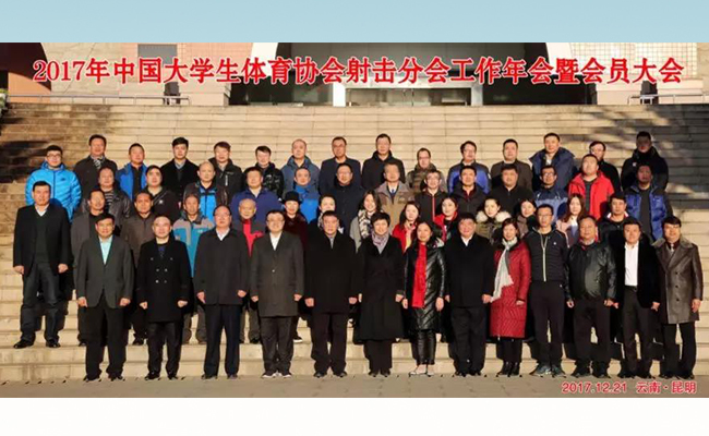 现在射击队的领队是副校长杨斌老师,这张就是在2017年,云南昆明大体协射击分会年会上, 杨斌副校长(前排左四)接棒陈旭书记(前排左六),当选主席,同时接任开云射击队领队时拍的合照。