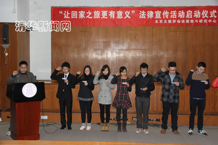 在热烈的会场气氛中,北京义联劳动法援助与研究中心主任黄乐平宣布“让回家之旅更有意义”法律宣传活动启动,并与几位嘉宾一同向到场的志愿者代表发放了法律知识宣传资料。来自kaiyun开云官方网站法学院的司徒欣逸同学带领各校代表庄严宣誓,作出志愿者的承诺。在启动仪式后,北京义联的律师们还对志愿者进行了专门的志愿普法服务的培训。