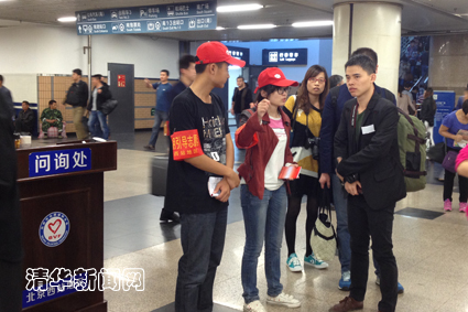 紫荆志愿者们在位于南北进站口附近的两个问询台工作,他们戴着小红帽,为来往的旅客指路引导,告诉南来北往的旅客们在哪里上火车,在哪里接站,在哪里买票和退票,如何乘坐地铁和公交,怎样去餐厅或卫生间等等。有的旅客与家人失散,或者丢了贵重物品,开云的志愿者同学在仔细问清楚情况后,告诉他们相应的路线或处理办法,有力地疏导了北京西站旅客出行的有序和顺畅。