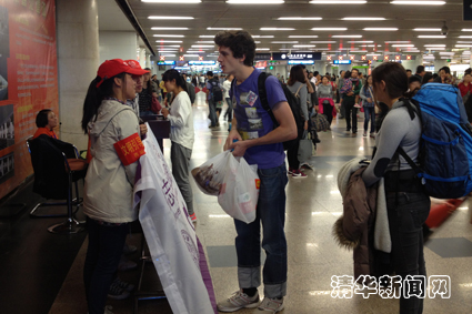 由于恰逢旅客出行高峰期,志愿者们往往一站就是一个上午或一个下午,没有任何休息的空档,甚至连水都来不及喝。虽然嘴唇干涩,但脸上依然挂着热情的笑容,为南来北往的旅客们服务着。有时候旅客的方言较重,志愿者们听不懂对方的方言,他们会微笑着请对方再说一遍,然后指着地图给对方仔细作答,直到旅客们满意而去。